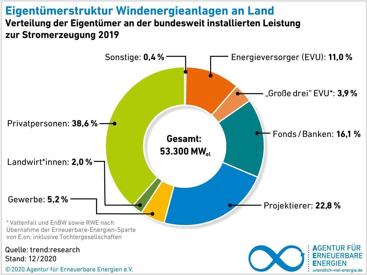Windenergieanlagen bedürfen eines Investments von mehreren Millionen Euro und rechnen sich in der Regel. Die Eigentümerstruktur von Windenergieanlagen an Land ist vielfältig.