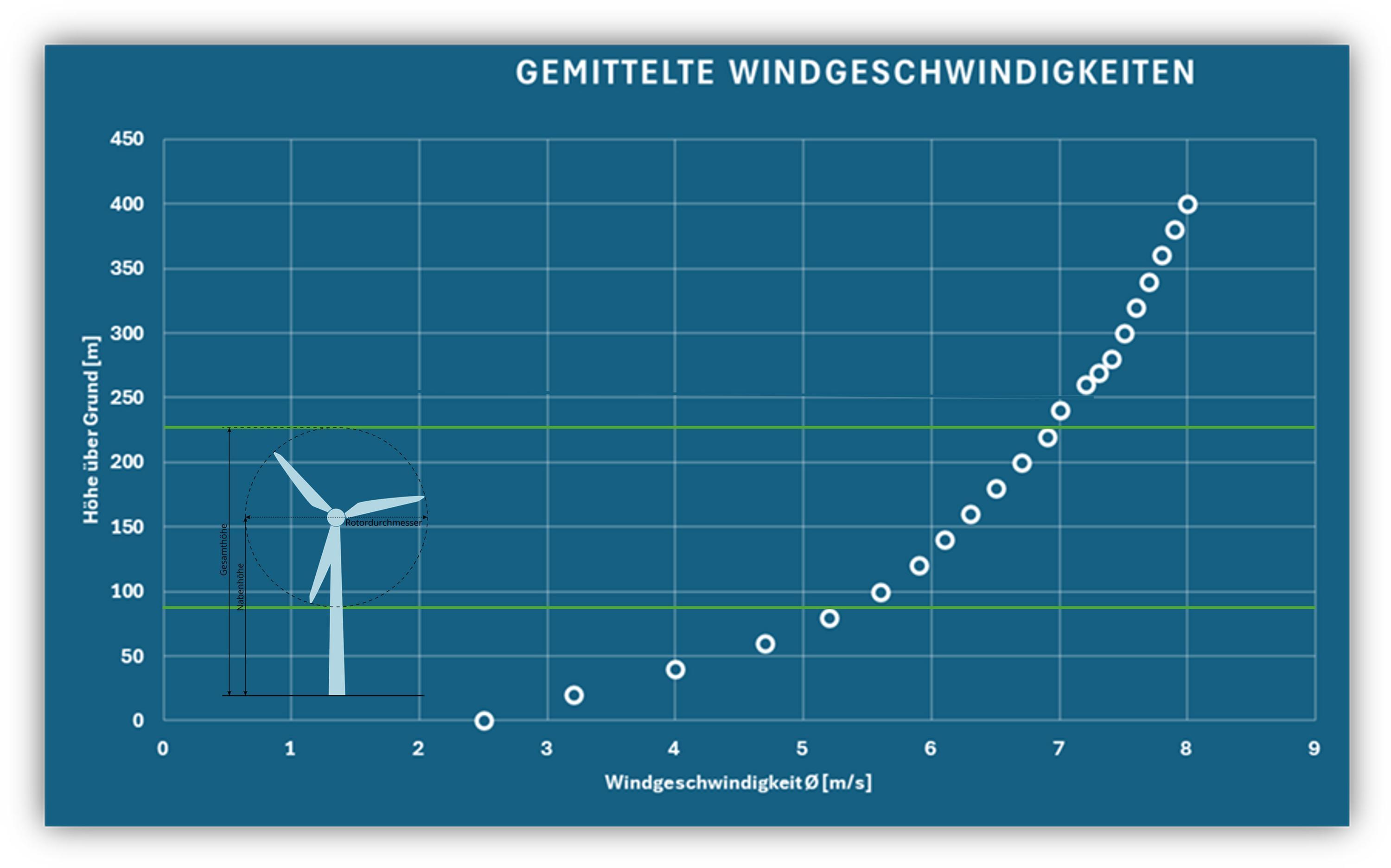 Im Landkreis Pfaffenhofen werden daher verstärkt sehr hohe Anlagen projektiert – zuletzt wurden im Bürgerwindpark Pfaffenhofen Türme mit einer Nabenhöhe von 160 m kombiniert mit großen Rotoren mit einer Rotorblattlänge von 69 m und einer Gesamthöhe von 229 m in Betrieb genommen. Im Diagramm ist exemplarisch ein Windrad dieser Größe eingezeichnet: vom Boden bis zur Rotorspitze. Man erkennt, dass die Rotorfläche dieser Windenergieanlage größtenteils in Höhen mit gemittelten Windgeschwindigkeiten zwischen 5,5 und 7 m/s liegt, während niedrigere Anlagen deutlich niedrigere Windgeschwindigkeiten abbekommen würden.